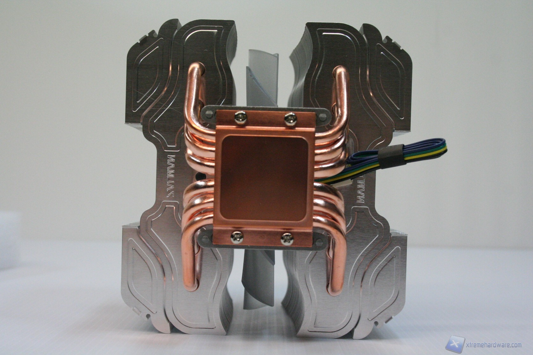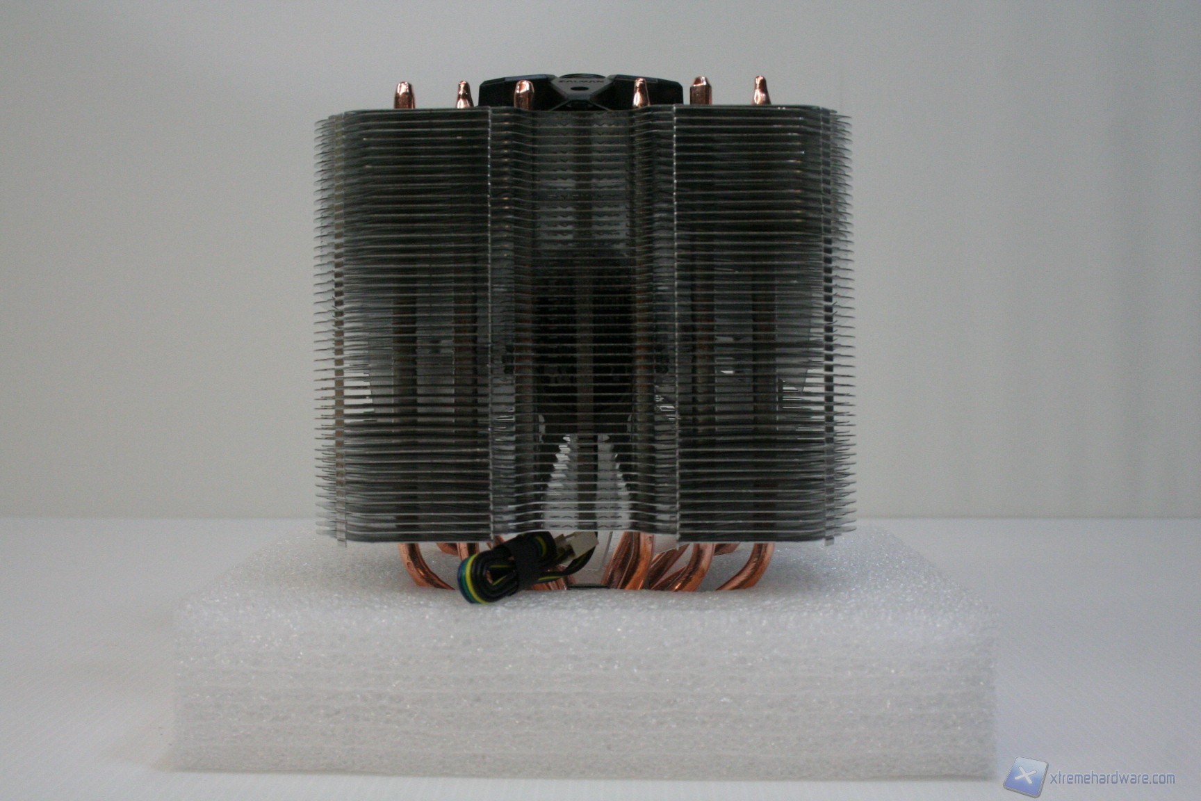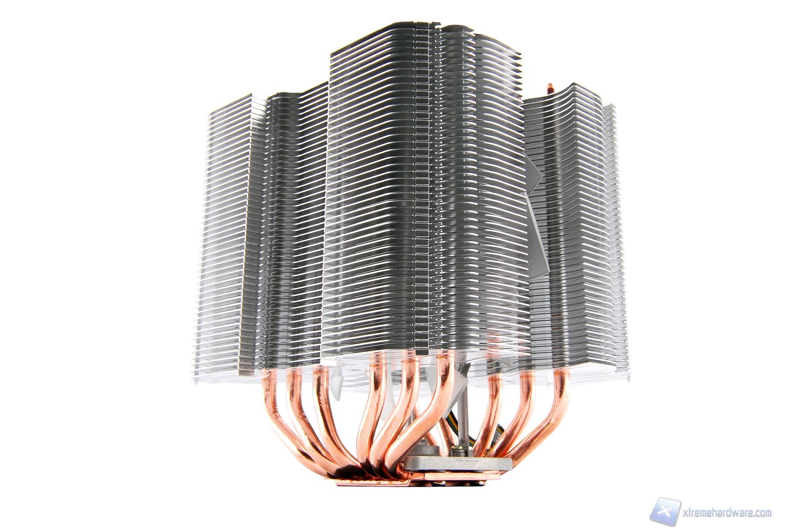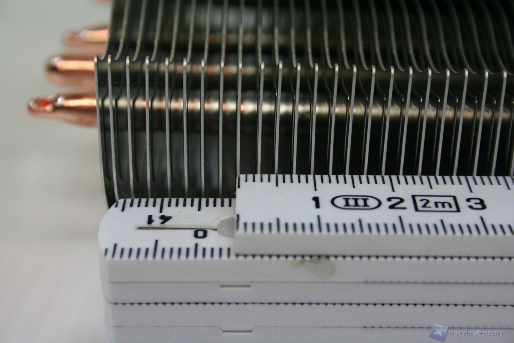 Le alette sono sottili, circa 0.4, mm ma non eccessivamente dense, 2.0mm, però data la struttura a doppia torre ci sarà una grande superficie dissipante. Sono presenti sei heatpipes da 6mm di diametro con un design ad “U”, al fine di massimizzare lo scambio termico e sono presenti anche dei motivi funzionali che miglioreranno l’aerazione nella parte centrale. E’ presente una leggerissima scudatura finale delle heatpipes e la lavorazione è buona.
