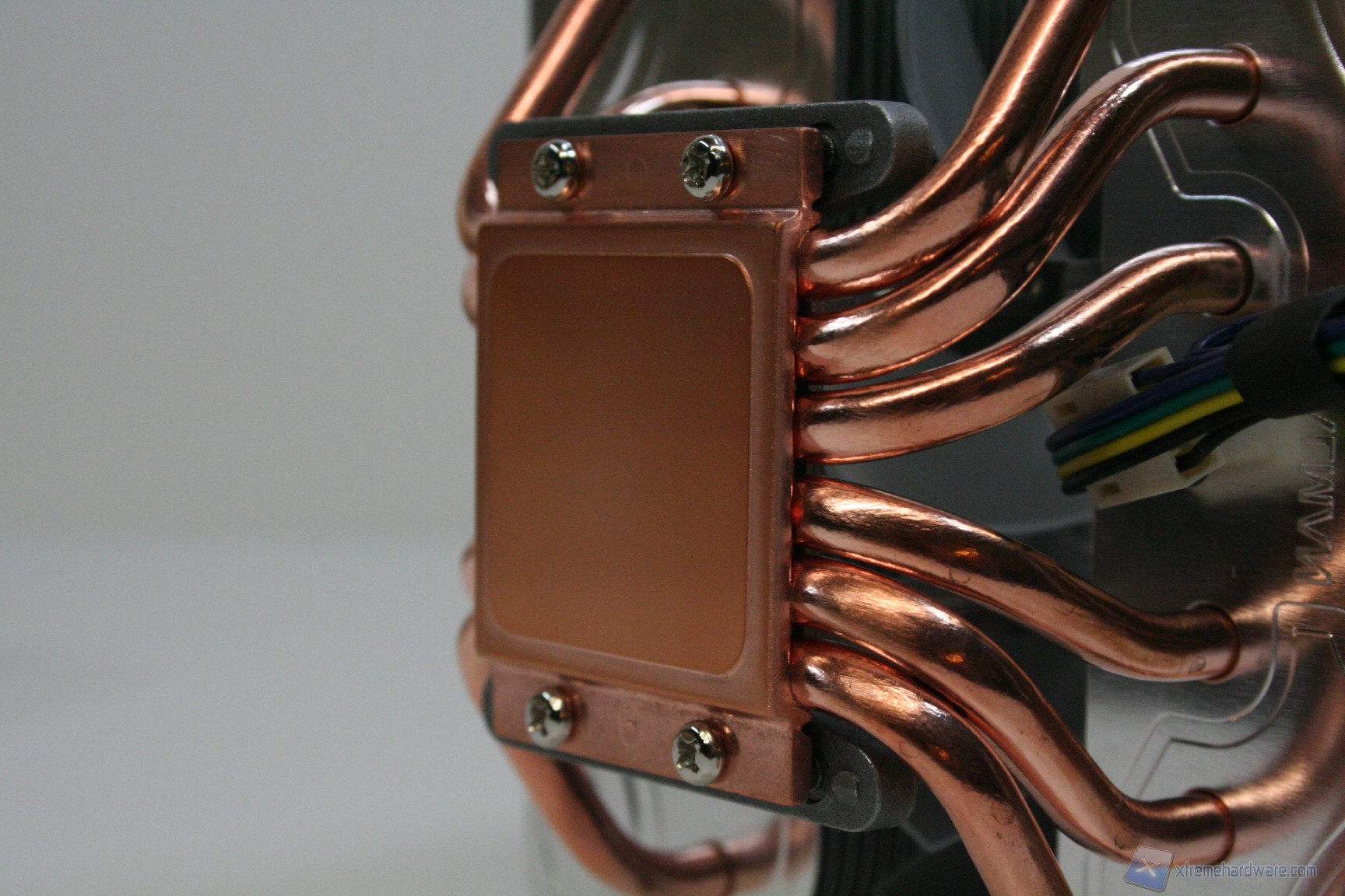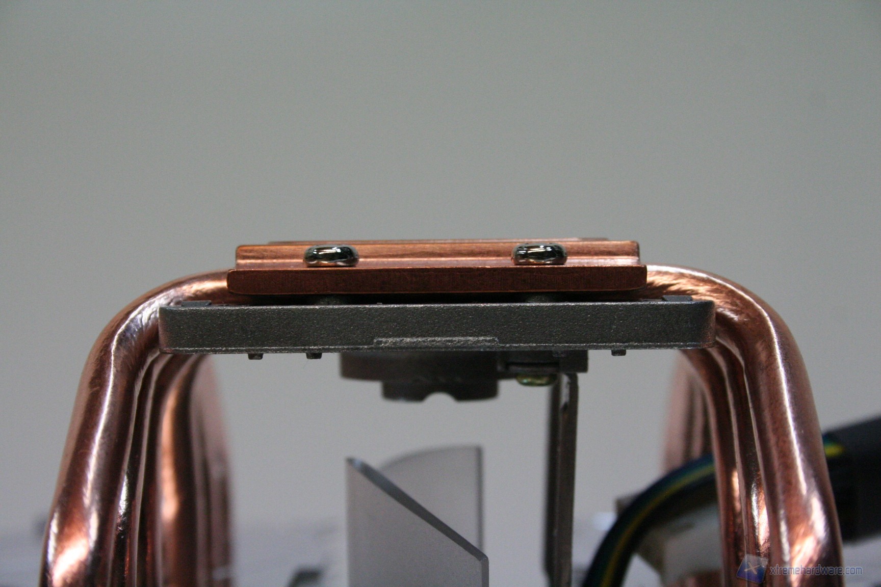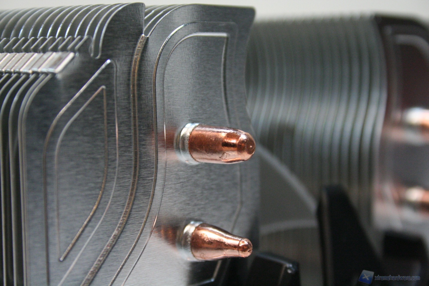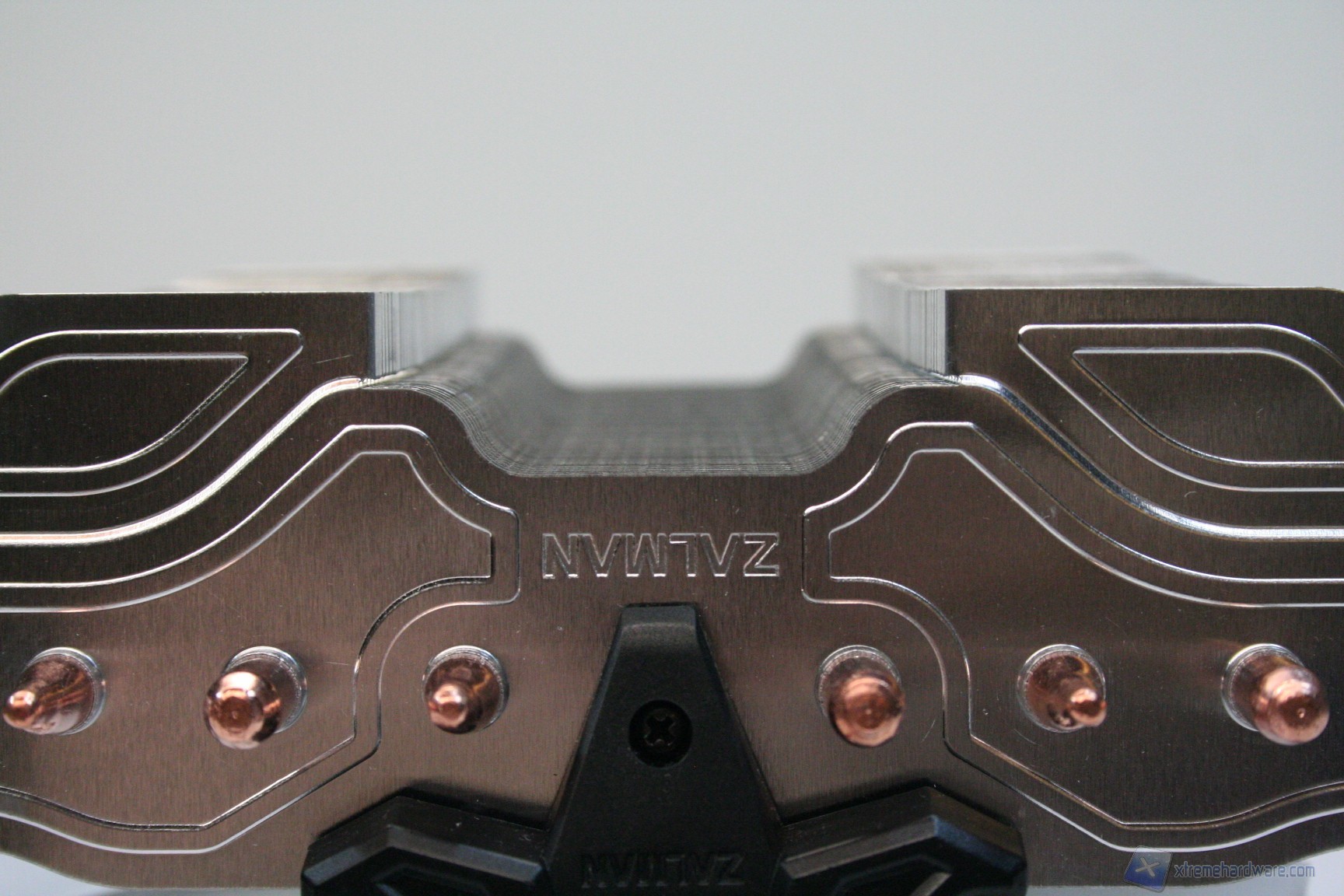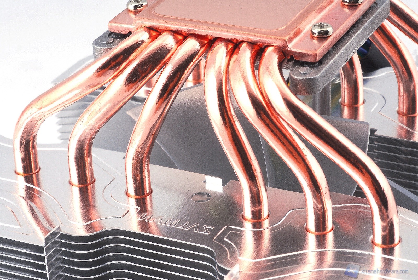 Le alette sono sottili, circa 0.4, mm ma non eccessivamente dense, 2.0mm, però data la struttura a doppia torre ci sarà una grande superficie dissipante. Sono presenti sei heatpipes da 6mm di diametro con un design ad “U”, al fine di massimizzare lo scambio termico e sono presenti anche dei motivi funzionali che miglioreranno l’aerazione nella parte centrale. E’ presente una leggerissima scudatura finale delle heatpipes e la lavorazione è buona.
