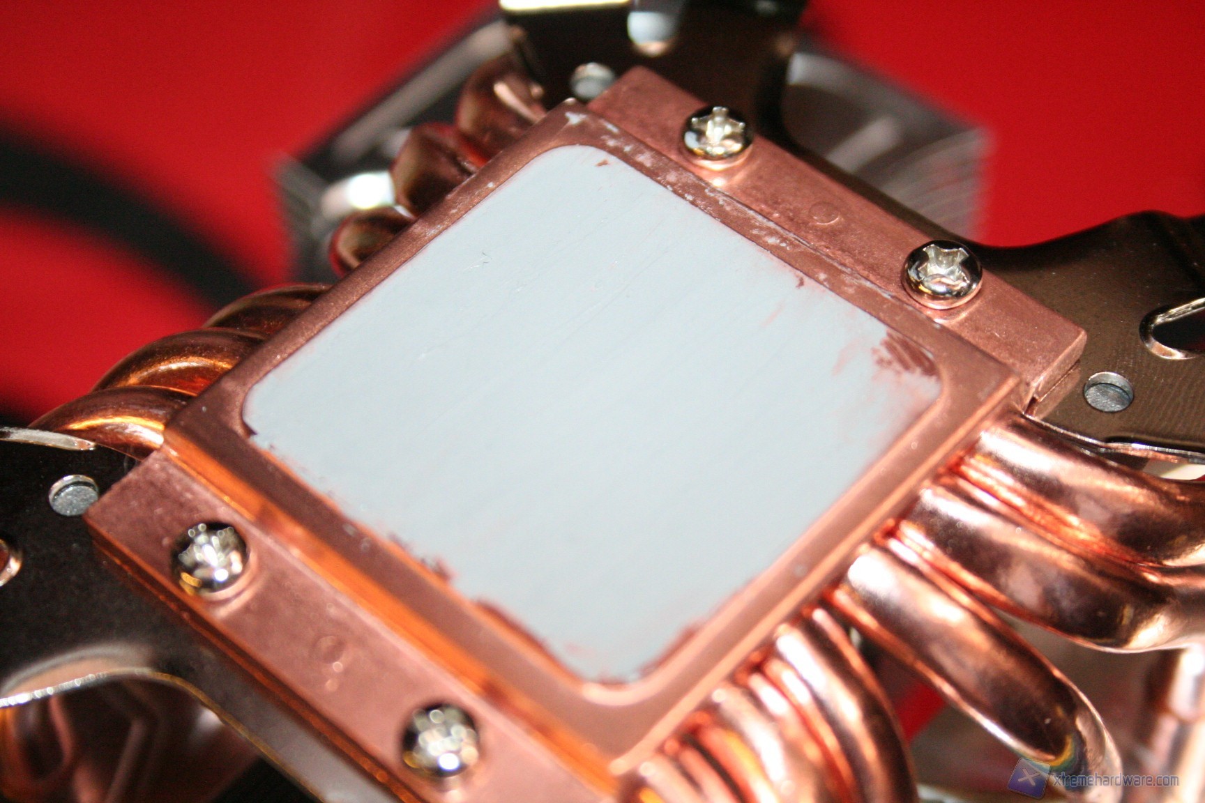 La base presenta una superficie in rame dalla lavorazione particolarmente buona, infatti non sono presenti sbavature, segni della lavorazione al tornio o eventuali saldature. Il tutto è omogeneo e di ottima fattura; la finitura non è a specchio, ma la superficie di contatto sarà quasi perfetta. Facciamo notare il particolare sistema di aggancio del socket, che è caratterizzato da due placche che andranno avvitate, grazie alle quattro viti presenti sulla base. Non abbiamo mai visto un sistema del genere, ma stando all’ottimo contatto è di buona fattura. Il meccanismo di fissaggio alla base però è la nota dolente di questo dissipatore in quanto il montaggio riteniamo che sia eccessivamente scomodo. Affronteremo successivamente questo aspetto nel capitolo dedicato. La base è perfettamente planare, quindi con il socket LGA 2011 si avrà un eccellente contatto, come vedremo.