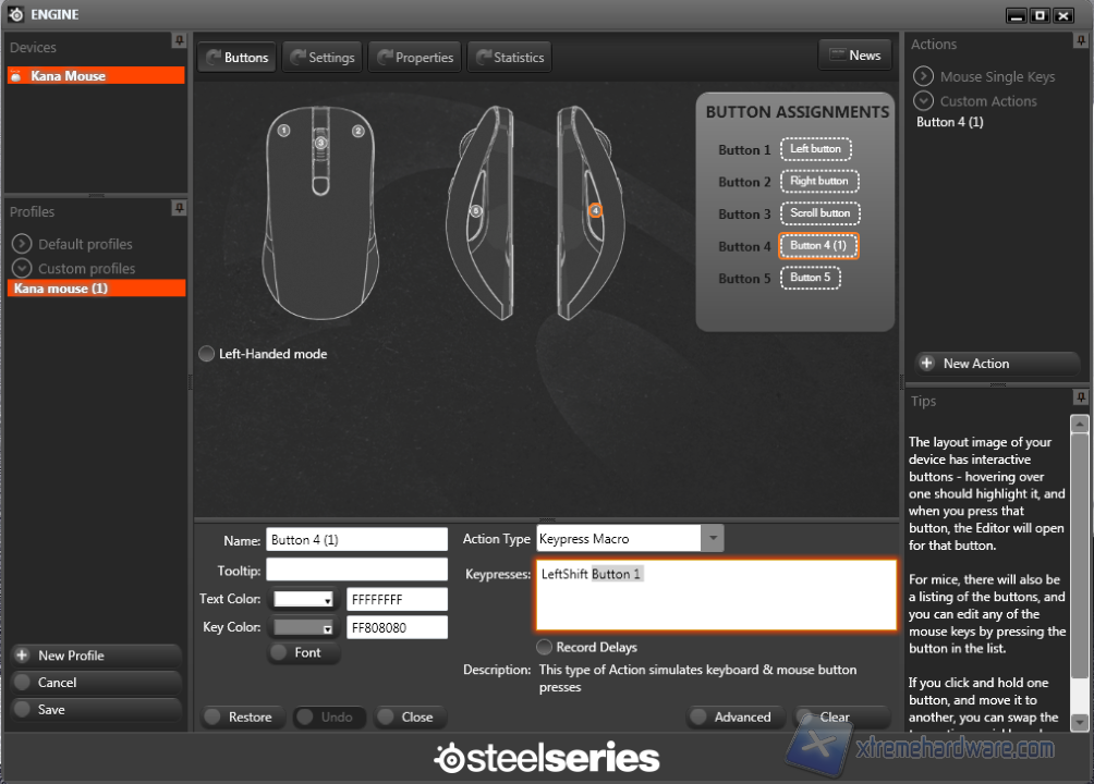 Lo SteelSeries Kana può essere usato anche senza installare i driver proprietari, ma in questo modo non sfrutteremo tutte le funzioni del mouse. Come abbiamo precedentemente detto, il CD driver non è compreso e per forza di cose dobbiamo scaricare i driver dal sito ufficiale. Una volta conclusa l’installazione possiamo accedere al menù principale. La prima schermata che ci appare davanti è quella riguardante l’assegnazione dei tasti. Qui possiamo scegliere se selezionare o meno la modalità per mancini in modo che i tasti click destro e sinistro siano invertiti. Inoltre cliccando su un pulsante presente nella figura interattiva, possiamo assegnare a ogni tasto una macro, sia premendo tasti del mouse sia tasti della tastiera. Sulla parte sinistra abbiamo l’elenco dei profili e la possibilità di creare, cancellare e salvare quest’ultimi.