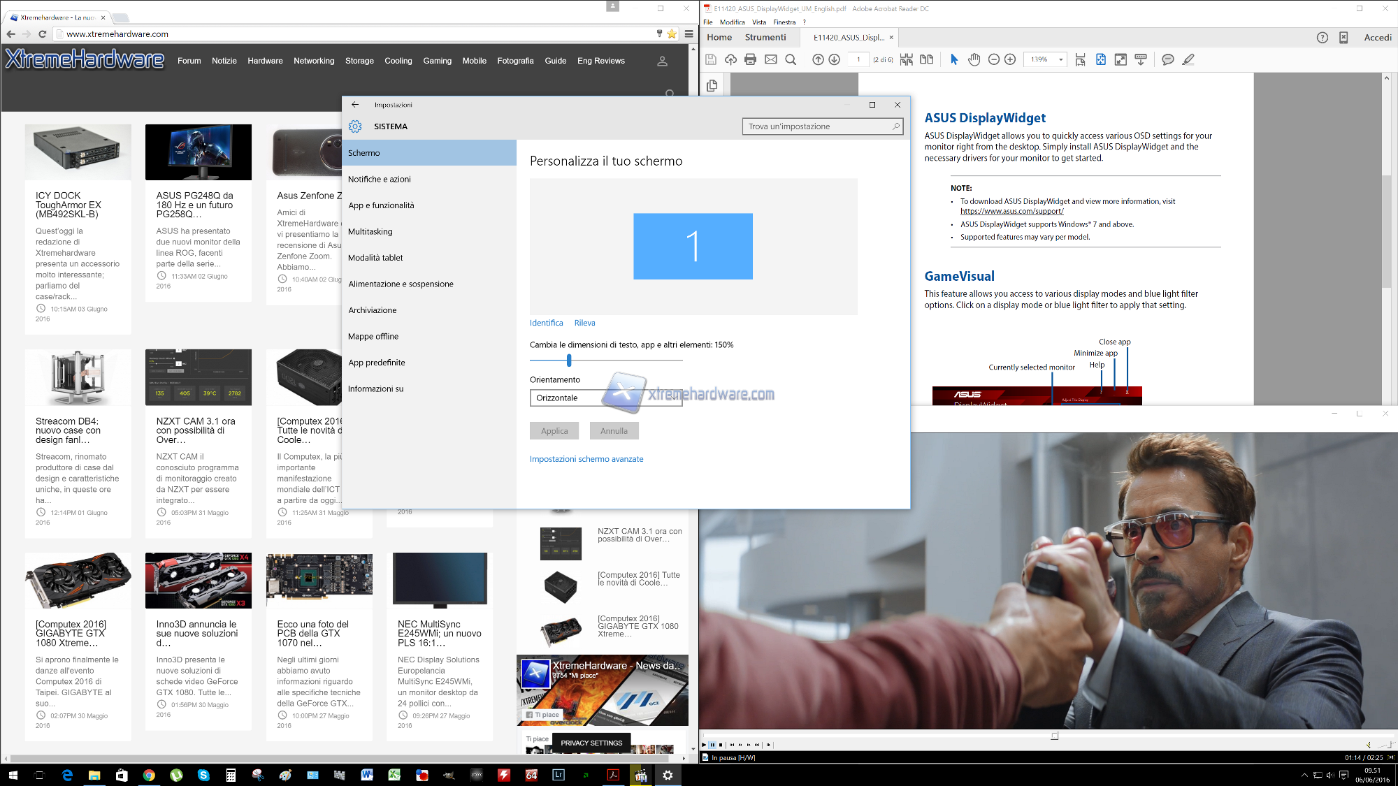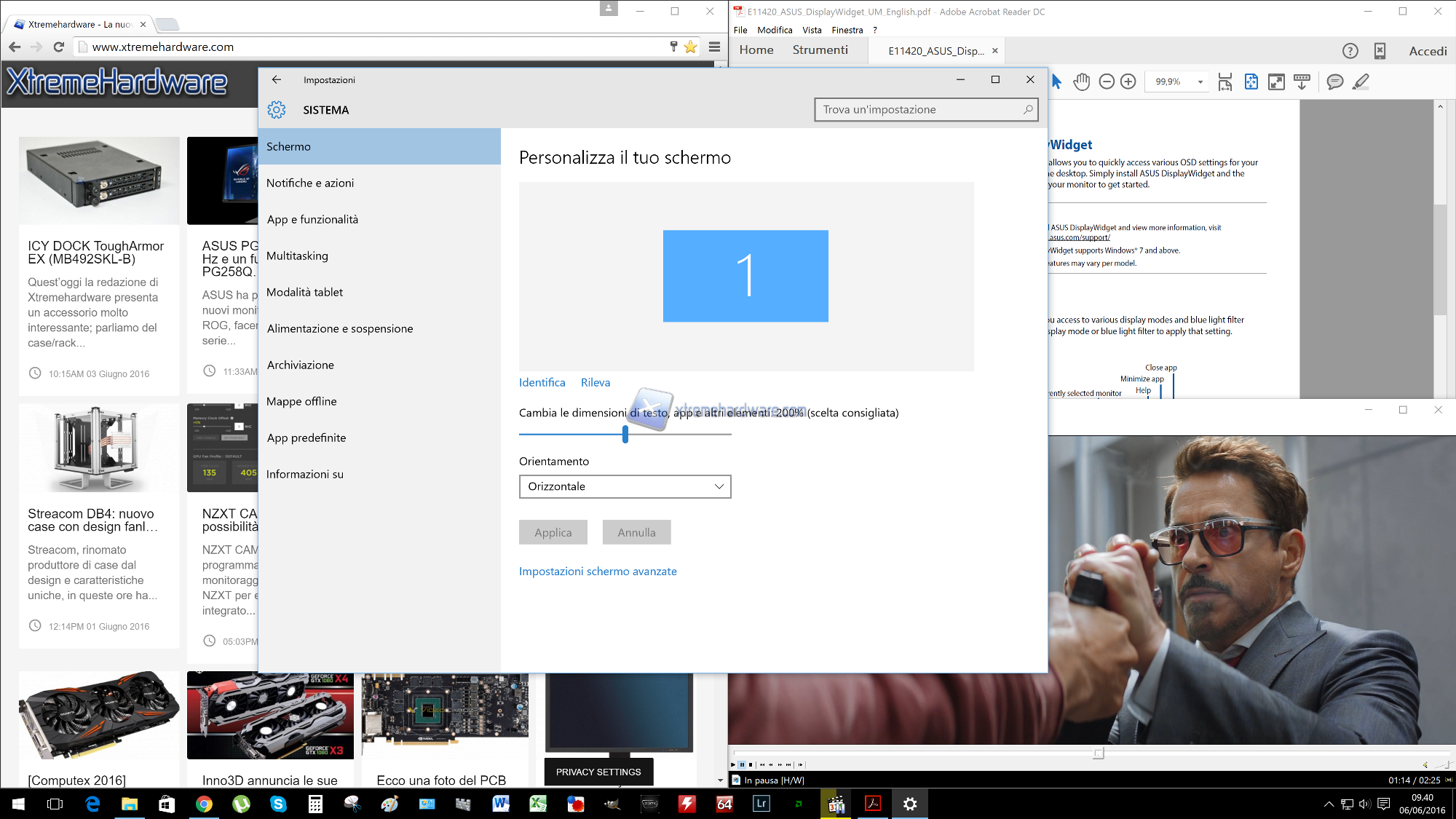 Abbiamo catturato tre screen del desktop con il valore di DPI al 100%, 150% e 200%. Il valore intermedio è quello che restituisce una definizione peggiore e risulta pertanto sconsigliabile; l’effetto non è ovviamente riscontrabile tramite screenshot. Nel confronto di come appaiono le finestre operative, precisiamo che il trailer del film è impostato sempre alla sua risoluzione nativa (Full HD) e facciamo notare che lo zoom del documento PDF varia nei tre casi. Alcuni software non riescono comunque ad essere mappati correttamente e mantengono la dimensione dei caratteri molto bassa; i software più comuni non hanno manifestato problemi di sorta e nel caso sembri che si verifichi una scarsa definizione, sarà sufficiente aumentare di uno step la nitidezza o VividPixel.
