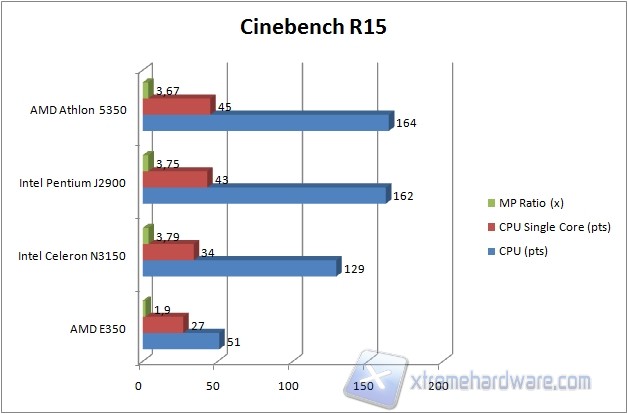 Cinebench mostra che il divario tra l'Intel J2900, l'N3150 e l'AMD 5350 non è molto marcato.