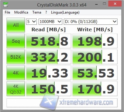 Come possiamo vedere dagli screen il controller adottato da questo SSD ci permette buone prestazioni in lettura. Nel modello da 120GB le prestazioni sono invece limitate a 200 MB/s, complice probabilmente la presenza di un minor numero di chip di memoria rispetto ai modelli di capacità maggiore.